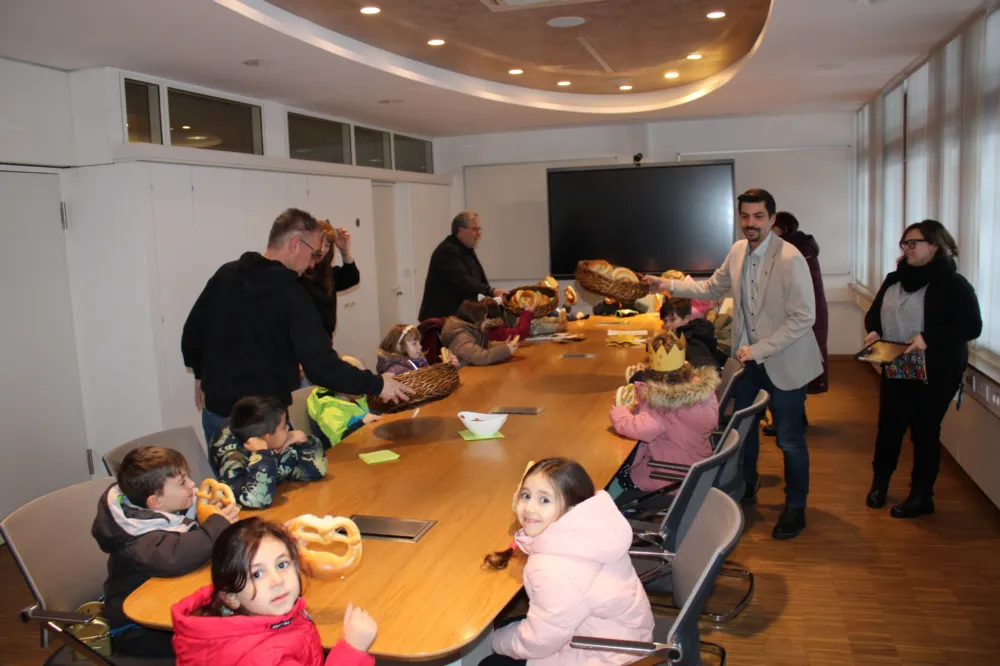 Freude im Homburger RathausSternsinger überbringen Segenswünsche10.01.2026Eine liebenswerte und schöne Tradition wurde auch in diesem Jahr am Tag der Heiligen drei Könige fortgesetzt: Die Gruppe der Vorschulkinder der Kindertagesstätte St. Michael besuchten an diesem Dienstag als Sternsinger das Homburger Rathaus. Mit ihrem Besuch überbrachten sie der Stadtverwaltung wie in den vergangenen Jahren auch nicht nur die besten Wünsche für ein gesegnetes Jahr, sondern sorgten auch für strahlende Gesichter bei Mitarbeitenden und Besuchern des Rathauses. Bürgermeister Manfred Rippel, der Beigeordnete Philipp Scheidweiler und auch Landrat Frank John empfingen die kleinen Gäste aus der unmittelbaren Nachbarschaft, die mit Sternen, Kronen und teilweise mit Gewändern ausgestattet waren, zunächst im Foyer des Rathauses. Dort sangen die Kinder, begleitet von den Erzieherinnen Nancy Ried, Melanie Roth und Tanja Sonntag sowie Pastoralreferent Stefan Pappon, zunächst das Lied „Stern über Bethlehem“ und trugen noch ein Gedicht vor. Die Verwaltungschefs waren begeistert von der lebendigen Tradition und lobten die Kinder und Erzieherinnen für den Einsatz der Jüngsten als Sternsinger sowie für den schönen Gesang und den Gedichtvortrag. Sie sorgten auch dafür, dass die Sternsinger ihre Spendendose nicht umsonst mitgebracht hatten. In diesem Jahr sammeln die Sternsinger vor allem Geld gegen Kinderarbeit, damit Kinder, beispielsweise in Bangladesch, zur Schule gehen können, statt in eine Fabrik, erklärte Stefan Pappon. „Es ist so schön, dass ihr heute zu uns ins Rathaus gekommen seid und die Botschaft der Heiligen drei Könige überbracht habt“, sagten Bürgermeister Rippel und der Beigeordnete Scheidweiler. Anschließend luden sie die Kinder zu einer leckeren Neujahrsbrezel ein und rundeten den Besuch der Vorschulkinder im Rathaus mit einer kurzen Besichtigung des Vorzimmers sowie des Büros des Oberbürgermeisters ab. Dabei unterhielten sich die Verwaltungschefs mit den Kindern auch über ihre Kindertagesstätte und über ihre bevorstehende Schulzeit ab diesem Sommer. Auch vom Landrat erhielten alle Sternsingerinnen und Sternsinger eine kleine Leckerei. Im Rahmen des Besuchs wurde auch der Aufkleber mit dem traditionellen Haussegen und der Botschaft „20*C+M+B+26“ - „Christus mansionem benedicat“ – „Christus segne dieses Haus“ - über der Tür zum OB-Büro erneuert. © Stadt HOM Bilder: Jürgen Kruthoff/Stadtverwaltungzur Übersicht Sie möchten eine Werbeanzeige schalten?Rufen Sie uns gerne unter +49 (0) 68 41 / 61 40 5 an oder nutzen Sie unser Kontaktformular.BagatelleDie Homburger StadtzeitungSeit Oktober 2019 bieten wir Ihnen auch an, die Bagatelle online zu lesen. Klicken Sie einfach auf den unten stehenden Link, um dann kostenfrei die Bagatelle als PDF lesen zu können. Um künftig noch schneller und aktueller zu sein, werden wir auch online für Sie noch präsenter sein. Viel Spaß wünscht Ihnen das Team der Homburger Stadtzeitung! Online-Ausgabe