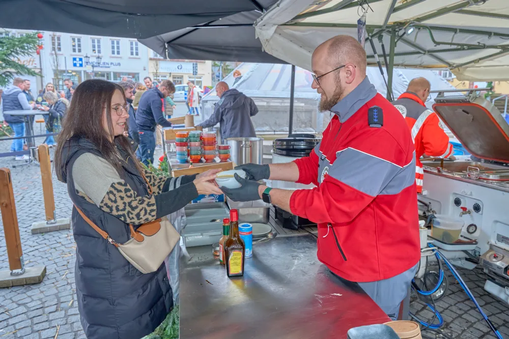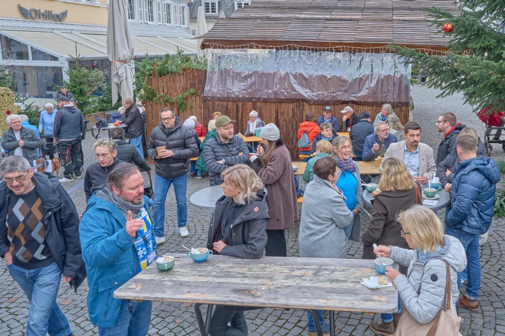 Offene Suppenküche auf dem Homburger Marktplatz"Mit Herz für Menschen" kam erneut eine enorme Spendensumme zusammen!10.01.2026Marco Dante, der gastronomische Leiter der beiden Gastronomiebetriebe "Oh!lio" und "Vin!Oh" am Homburger Marktplatz gelegen, erklärte im Interview: "Die diesjährige Suppenküche startete am Mittwoch. Francesco Nardi und ich waren ab 6 Uhr morgens da und haben angefangen mit der Suppe. Von der Firma Vario Pack haben uns Christoph Bonaventura und Peter unterstützt und gemeinsam haben wir 600 Liter Gulaschsuppe gekocht. Allein dafür haben wir 130 Kilogramm Rindfleisch verwendet und unzählige Paprikas, Zwiebeln, Selleriestangen und alles, was sonst noch so hinein gehört." Er führt weiter aus, dass dies zirka 1200 Portionen gleich am ersten Tag darstellte, alles draußen in der Feldküche von Harald Borchert zubereitet. Respekt! Hiervon gingen dann auch gleich 1000 Portionen am ersten Aktionstag weg. Am Folgetag waren also noch 200 Portionen Gulaschsuppe übrig, denn weggeworfen werde hier nichts, wie Marco Dante betonte. "Für den Mittwoch haben wir eine schöne Hühnerbrühe gemacht mit Tortellini und eine Kartoffelsuppe mit Kalbswienern – also die Kalbswiener natürlich extra, damit die Suppe auch vegetarisch ist." Freitags dann gab es auf dem Speiseplan einen Bohneneintopf sowie eine Tomatensuppe. In vorweihnachtlicher Atmosphäre wurden frisch zubereitete, dampfende Suppen an die Bürgerinnen und Bürger ausgegeben. Gleichzeitig ging es dabei jedoch um weit mehr als nur um eine warme Mahlzeit. Der Homburger Marktplatz verwandelte sich erneut in einen Ort der Begegnung, an dem Menschen unterschiedlichster Herkunft an einem Tisch zusammenkamen. Auch lokale Akteure aus der Politik kamen gerne in ihrer Mittagspause her, aßen und spendeten für einen guten Zweck und begegneten den anderen Besuchern in gewohnter saarländischer Manier auf Augenhöhe. Die Suppenküche 2025, von Giuseppe Nardi ins Leben gerufen, war erneut ein deutliches Signal im Saarland für Homburgs Solidarität und Mitmenschlichkeit. Überaus wichtig, wie wir von der Redaktion finden, und das in einer Zeit, die leider viel zu oft von Hektik und Konsum geprägt ist. So gesehen steht die Veranstaltung "Offene Suppenküche" im doppelten Sinne für "Wärme, die von innen kommt". Das Konzept war bisher immer genauso simpel wie wirkungsvoll. In diesem Jahr kamen 20.000 Euro an Spenden zusammen. Diese Summe geht restlos an das DRK für Ausbildung, Ausrüstung und den Einsatz der ehrenamtlichen Helfer. (Hintergrund ist die Insolvenz des Verbandes im vergangenen Jahr, durch die finanzielle Mittel fehlen, um Aufgaben wie Ausbildung und Ausrüstung der Helfer oder Material für Einsätze sicherzustellen. Von den Spenden profitieren unter anderem die Rettungshundestaffel und Bereiche des Katastrophenschutzes.) Bedanken möchte sich Marco Dante auch noch ganz herzlich bei dem Oh!lio/Vin!Oh-Team, den ehrenamtlich Helfenden bei der Suppenausgabe, den Sponsoren Dr. Theiss Naturwaren GmbH, der Kreisstadt Homburg, dem Deutschen Roten Kreuz Kreisverband Homburg e.V. und Harald Borchert von der Firma VARIO PACK, mit seiner zur Verfügung gestellten mobilen Feldküche, und nicht zu vergessen den vielen fleißigen Händen aller Helferinnen und Helfer, um einen reibungslosen Ablauf der 3-Tage-Aktion gewährleistet zu haben. Für viele Menschen ist die Aktion regelrecht zu einem "Ritual in der Homburger Adventszeit" geworden, und da die Aktion nun schon zum 8. Mal stattfand, dürfen wir wohl auch von einer kommenden 9. Auflage ausgehen. Eine Aktion, die Gemeinschaft schafft und Wärme dorthin bringt, wo sie dringend gebraucht wird. Text: Chris Ehrlich Bilder: Chris Ehrlichzur Übersicht Sie möchten eine Werbeanzeige schalten?Rufen Sie uns gerne unter +49 (0) 68 41 / 61 40 5 an oder nutzen Sie unser Kontaktformular.BagatelleDie Homburger StadtzeitungSeit Oktober 2019 bieten wir Ihnen auch an, die Bagatelle online zu lesen. Klicken Sie einfach auf den unten stehenden Link, um dann kostenfrei die Bagatelle als PDF lesen zu können. Um künftig noch schneller und aktueller zu sein, werden wir auch online für Sie noch präsenter sein. Viel Spaß wünscht Ihnen das Team der Homburger Stadtzeitung! Online-Ausgabe